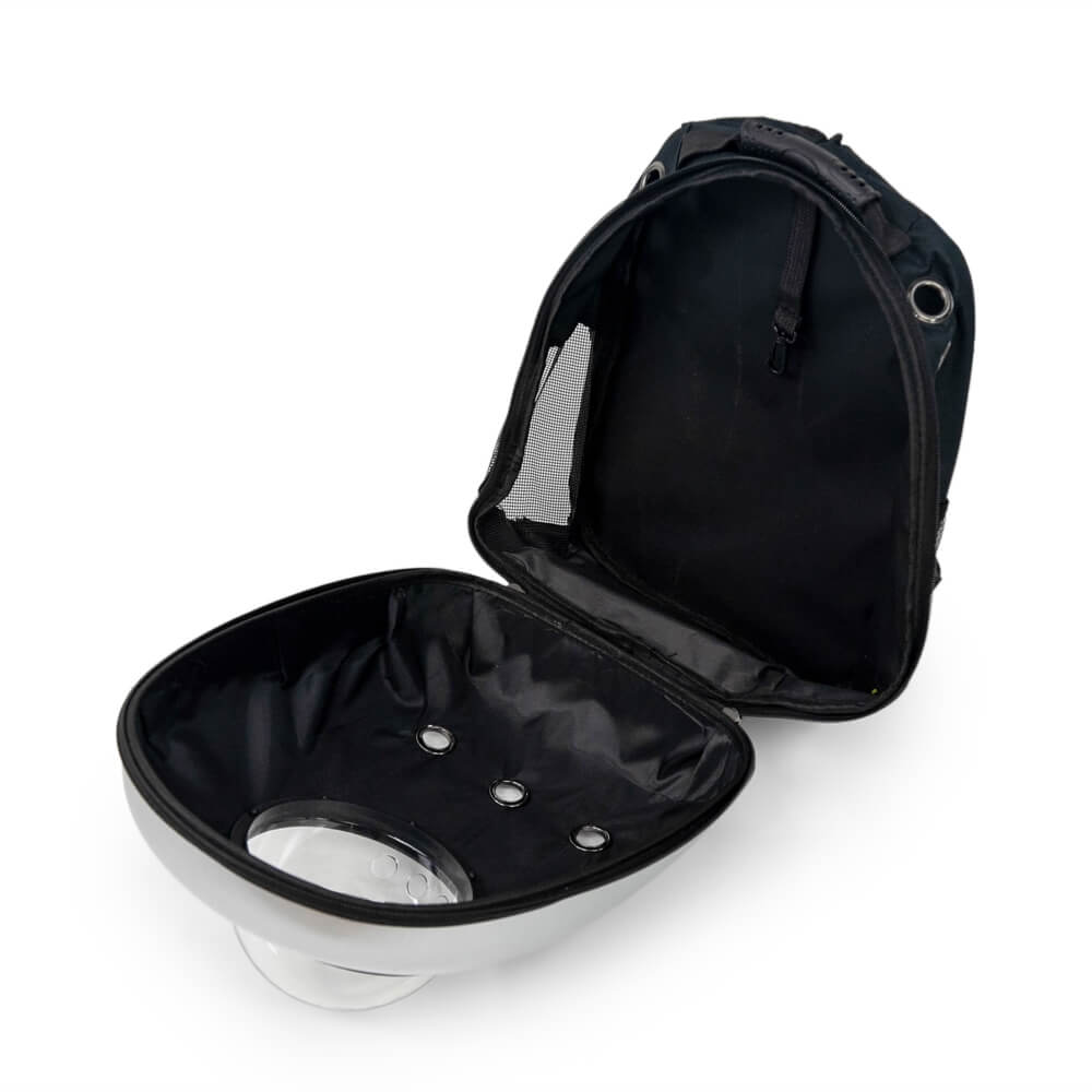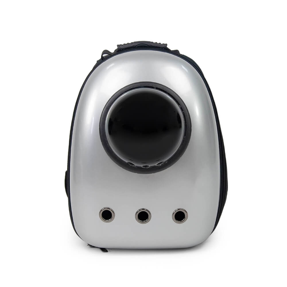 Рюкзак из прочного поликарбоната для переноски кошек и небольших собак. Круговой замок молния обеспечивает полное раскрытие рюкзака. На боковых поверхностях имеются сетчатые окошки для вентиляции. Сферический иллюминатор на крышке рюкзака обеспечивает достаточную освещенность и позволяет визуально контролировать состояние животного.
